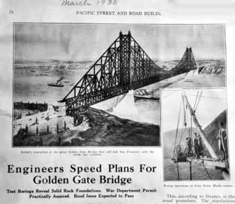 "Engineers Speed Plans for Golden Gate Bridge" - Ein Artikel von Pacific Street und Road Builder aus dem März 1930, in dem es heißt: "Testbohrungen enthüllen solide Felsfundamente und zeigen ein Foto von Bohrarbeiten auf der Lime Point-Seite der Brücke in Marin County, Kalifornien.